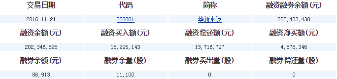 華新水泥(600801)2016-11-21融資融券信息顯示,華新水泥融資余額202,346,525元,融券余額86,913元,融資買入額18,295,143元,融資償還額13,716,797元,融資凈買額4,578,346元,融券余量11,100股,融券賣出量0股,融券償還量0股,融資融券余額202,433,438元。華新水泥融資融券詳細信息如下表: