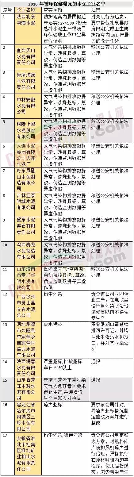 環(huán)保督察的高調(diào)執(zhí)行,一方面加強了督察的力度和聲勢,悍衛(wèi)了環(huán)保法的權(quán)威;另一方面也曝光了企業(yè)的一些問題。這些問題在督察中暴露,能夠迫使地方政府主要負責人下決心解決。被環(huán)保部曝光的17家水泥企業(yè),列表如下: