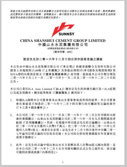山水水泥1月13日公布,已委任JLA Asia Limited調(diào)查宓敬田的涉嫌失職行為,JLA近期已完成調(diào)查。根據(jù)JLA詢問公司董事會及山東山水董事會成員所得的結(jié)果,公司已通過董事會決議授權(quán)及指示公司的全資附屬公司China Pioneer Cement (Hong Kong) Company Limited,以其作為山東山水的唯一股東通過決議,自2017年1月12日起即時免除宓敬田在山東山水及其所有附屬公司的所有職務(wù)、權(quán)力及職責,包括其山東山水的董事職務(wù)及副董事長職務(wù),以及免除宓敬田與公司、附屬公司及其關(guān)聯(lián)公司的所有雇傭關(guān)系。