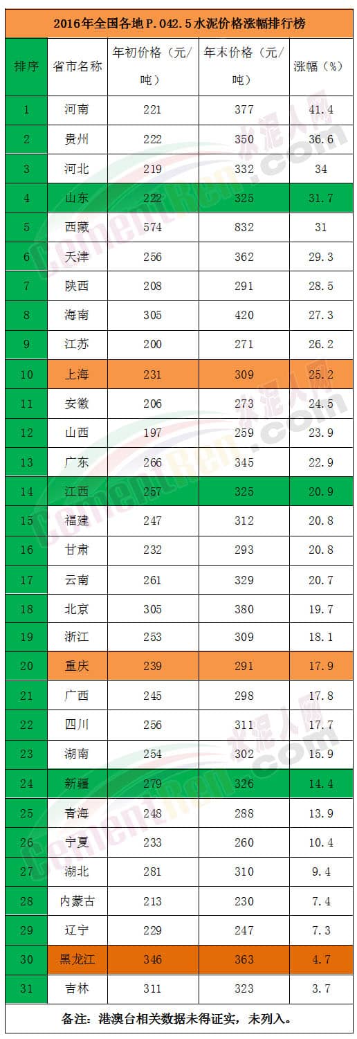 2016年受原材料、環(huán)保政策、運輸成本上漲影響,各地水泥價格都出現不同幅度的增長。西藏水泥價格曾逼近1000元/噸,但是細算其漲幅,它的全年漲幅僅為31%,并不如價格那么驚人,排名第五。河南水泥價格經過連續(xù)7次協同提價,價格曾出現日漲100元/噸的現象,最高價位逼近500元/噸,目前有所回落,全年漲幅為41.4%,排名第一。海南水泥價格上半年漲勢不明朗,在11月出現一波上漲行情,拉升全年漲幅,致使排名第八。貴州水泥價格全年處在細漲慢爬狀態(tài)中,沒那么引人注意,到年底卻不聲不響達到了一個驚人的漲幅36.6%,排名第二。河北水泥價格上漲呈階梯形,它每上一臺階,然后在此平臺上調整2-3個月,然后繼續(xù)上漲,全年漲幅34%,排名第三。全年漲幅以東北三省最低,其中吉林以漲幅3.7%墊底。