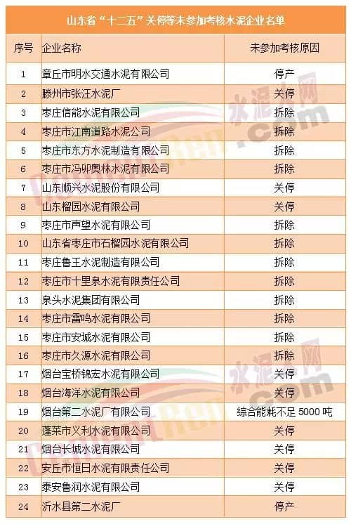 據統計,“十二五”山東省列入國家萬家企業節能低碳行動的水泥企業總共74家,除24家因關停等原因未考核外,實際考核50家。其中,超額完成31家,占62%;完成19家,占38%。24家未考核的水泥企業,原因有停產、關停、拆除、產能不足等,其中停產2家,占8.3%;關停9家,占37.5%;拆除12家,占50%;綜合能耗不足5000噸1家,占4.2%;關停企業名單列表如下: