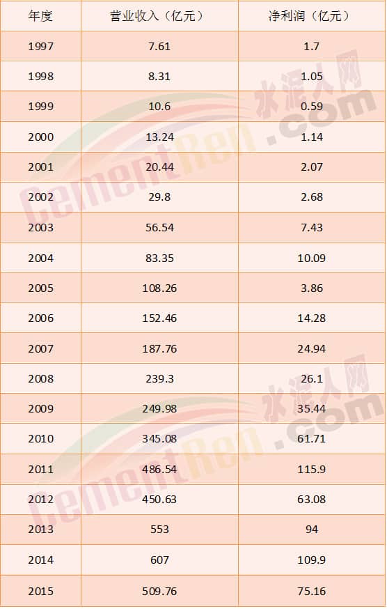 郭文叁時期(1997-2015年)海螺水泥營業收入與凈利潤表