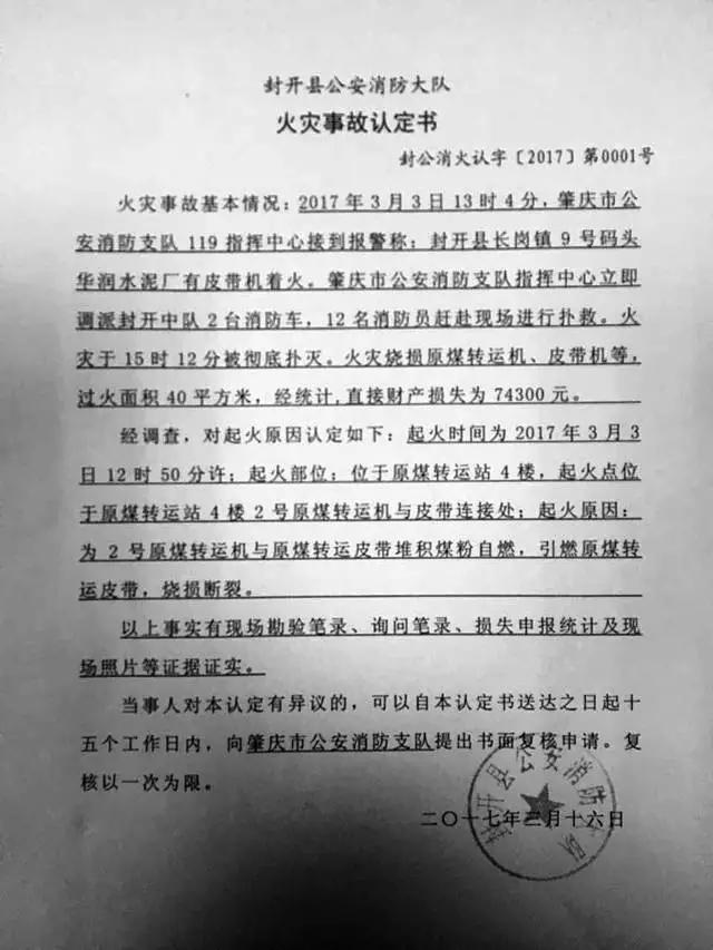 華潤水泥(封開)有限公司所在地肇慶市封開縣公安消防大隊已于昨日(3月16日)出具了火災事故認定書(封公消火認字[2017]第0001號)事故認定書描述的起火原因為:2號原煤轉(zhuǎn)運機與原煤轉(zhuǎn)運皮帶堆積煤粉自燃,引燃原煤轉(zhuǎn)運皮帶,燒損斷裂。火災燒損原煤轉(zhuǎn)運機、皮帶機等,過火面積40平方米,直接財產(chǎn)損失為74300元。