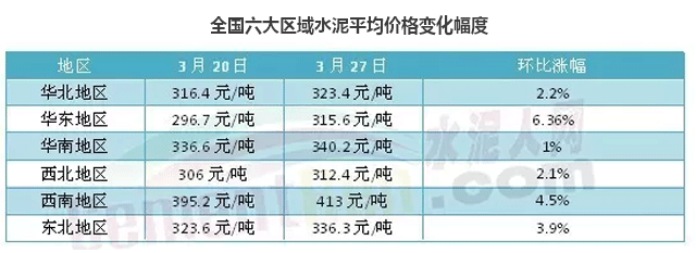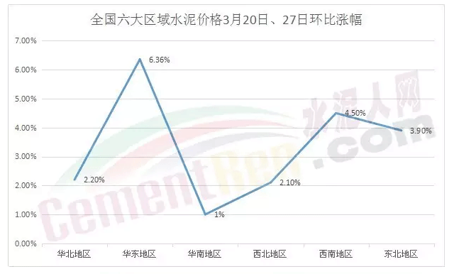 圖:全國六大區域水泥價格3月20日、3月27日環比漲幅(港澳臺地區除外)