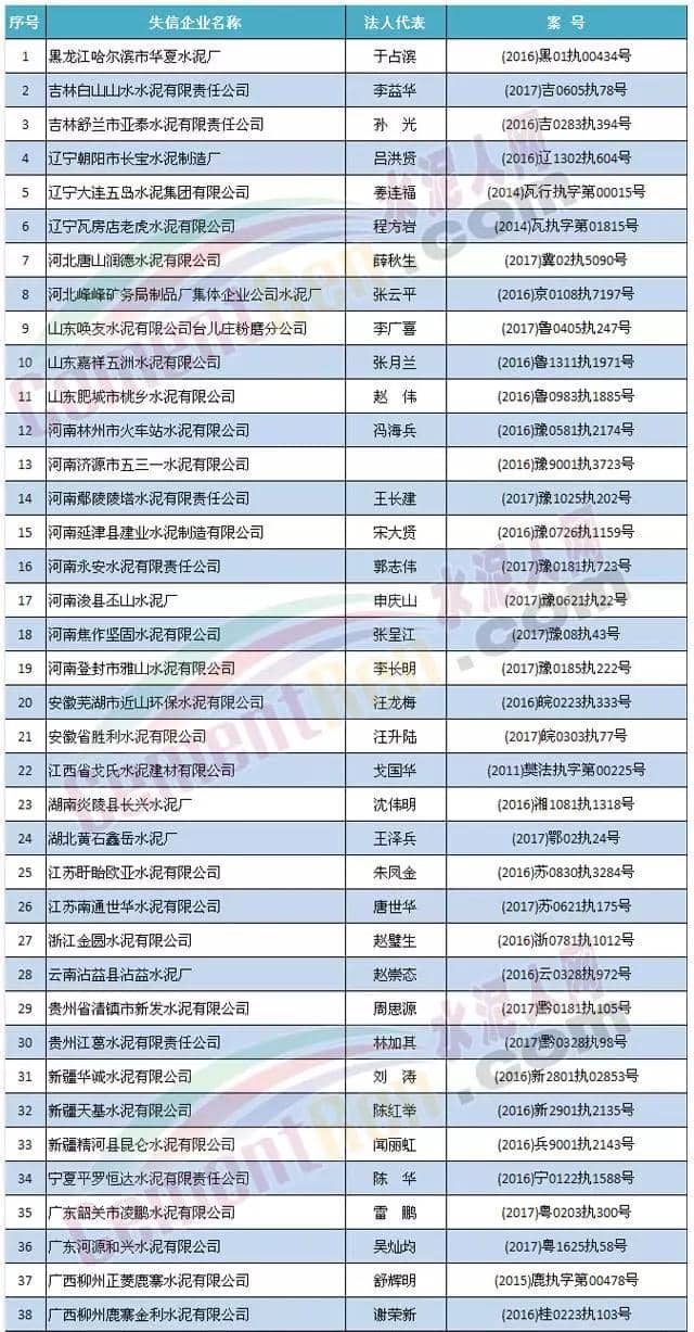 水泥企業雖有央企、國企、民企之分,在收入以及福利方面,部分央企、國企的高管雖旱澇保收,但無論是什么性質的企業,無論是管理層,還是一線員工,誠信始終是立足之本。一旦被列入“失信”黑名單,生活、出行將受到重大影響。下面,小編匯總了3月份,我國水泥企業失信名單,共38家水泥企業上失信名單,相應的法人代表要注意啦!
