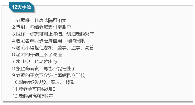 隨著法制的完善,未來,“失信代價”越來越高”。根據《中華人民共和國民事訴訟法》第二百五十五條規定,對被執行人進行公開曝光,同時加入最高人民法院“失信被執行人名單庫”,并通過該名單庫統一向全社會公布,系自然人的,在全國范圍內限制乘坐飛機、高鐵等高消費行為,限制辦理貸款、銀行卡等;系法人、社會團體等單位的,將同時依照法律、法規和有關規定,在政府采購、招標投標、行政審批、政府扶持、融資信貸、市場準入、資質認定等方面,對失信被執行人予以信用懲戒。對于“老賴”,最高人民法院將用12大手段懲治,有人調侃,這是對付渣渣老賴們的“酷刑”!
