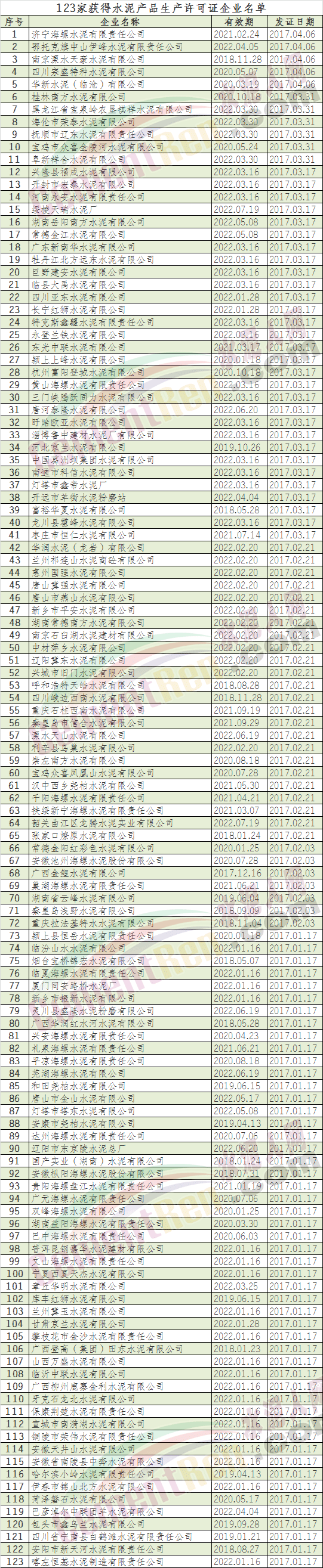 日前,國家質量監督檢驗檢疫總局公布了2017年1月至4月獲證企業名單,水泥行業獲得水泥產品生產許可證的企業有123家,水泥人網匯總列表如下: