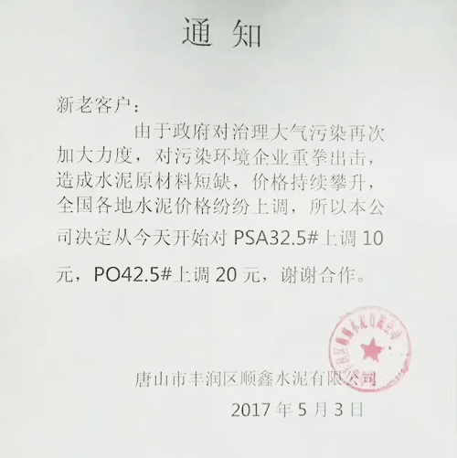 河北唐山豐潤(rùn)區(qū)順鑫P.O42.5水泥價(jià)格5月3日起上漲20元/噸