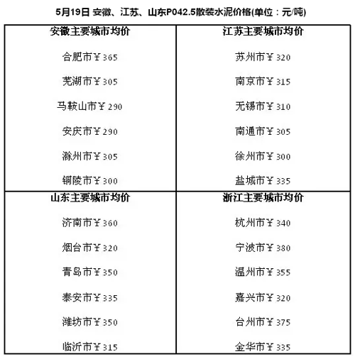 據了解,長三角沿江熟料價格上漲20元/噸,漲幅達到80-90元/噸,出廠價達320元/噸-340元/噸,這是今年來沿江熟料價格第四次漲價。此輪漲價在市場意料之外,明顯超預期。由于沿江熟料價格是華東地區水泥價格的風向標,預計在今年6月淡季來臨前,安徽、山東、江蘇和浙江的水泥價格有望再跟隨熟料價格普漲一輪。水泥人網匯總了這些地區的最新價格,匯總如下: