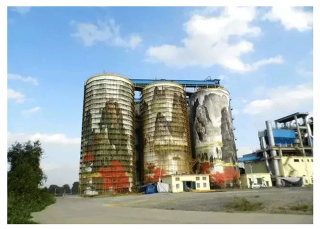 把國畫畫到水泥罐上,夠新鮮的了!這家水泥廠太有創意。據了解,這3個水泥罐高44米。國畫總面積4千多平米,這應該是世界上最大的山水國畫了。每年都能吸引不少游客前來拍照!