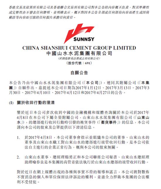 26日午間,山水水泥于港交所發(fā)布公告稱,2017年4月8日,董事會(huì)指示并組織本公司的董事、山東山水的董事及山東山水職工對(duì)山東山水的總部進(jìn)行接管收回行動(dòng),是本公司依法自主進(jìn)行的企業(yè)正常行為,概與本公司的股東無關(guān)。