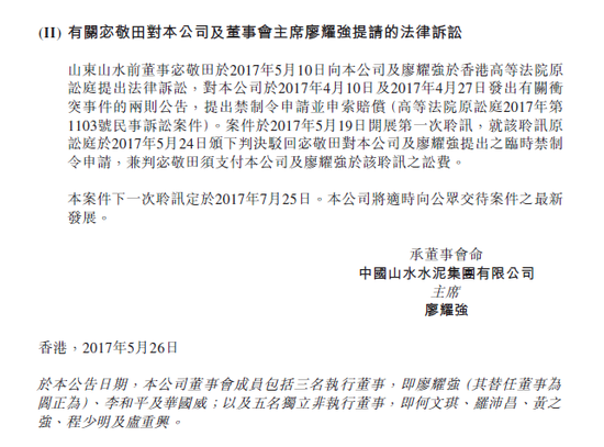 公告指出,山東山水董事、總經(jīng)理?xiàng)钣抡捅竟韭?lián)席公司秘書、山東山水總經(jīng)理助理喻春良是本集團(tuán)的高管并依法執(zhí)行于山東山水總部的接管收回行動(dòng)。宓敬田對(duì)本公司及董事會(huì)主席廖耀強(qiáng)提請(qǐng)的法律訴訟,本案件下一次聆訊定于2017年7月25日。