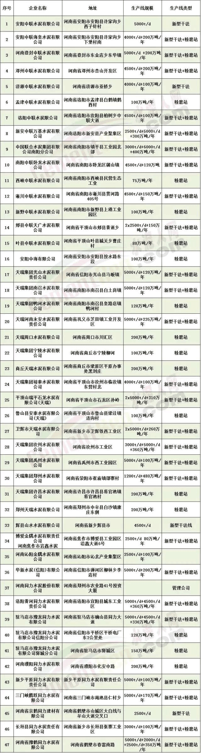據相關數據統計河南省轄區內水泥企業有50余家,涉及前20強水泥龍頭企業的熟料生產線40多條。其中包括中國聯合水泥14條熟料生產線,天瑞集團12條水泥熟料生產線以及同力水泥的11條水泥熟料生產線,也包括華新水泥、山水水泥、金隅水泥等水泥龍頭企業的水泥熟料生產線。