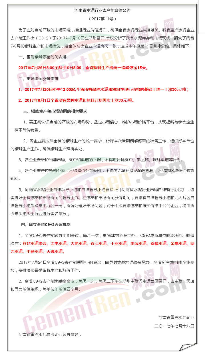 “自律公約”要求河南全省熟料生產線2017年7月26日8:00至8月10日8:00,統一錯峰停窯15天;2017年7月20日中午12:00起,全省所有品種水泥和熟料在現行價格的基礎上統一上漲30元/噸;2017年8月1日全省所有品種水泥和熟料計劃再次上漲30元/噸。
