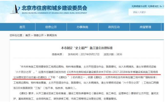 北京要求,城六區及10個新城區的各類道路工程、水利工程、土石方作業和房屋拆遷施工等全面停工,停工4個月(2017年11月15日至2018年3月15日)。對拒不停工項目、揚塵不達標等項目,將暫停相關單位的投標資格。