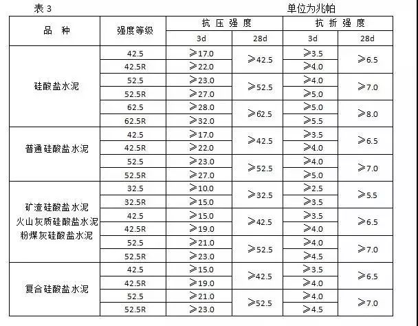 不同品種不同強度等級的通用硅酸鹽水泥,其不同齡期的強度應符合表3的規定。