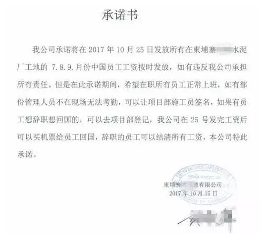 承諾書稱,將在10月25日發放所有在工地的中國員工7、8、9月份的工資,并希望在此之前工人們都能正常上班。