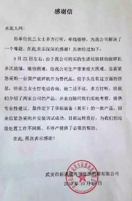 出于同水泥人網長期的戰略合作,做出采購決定前,新峰水泥郭總立即向水泥人網咨詢,水泥人網接到信息后,迅速響應,市場總監張蘭二話不說,立即向其介紹了兩家供應商單位。