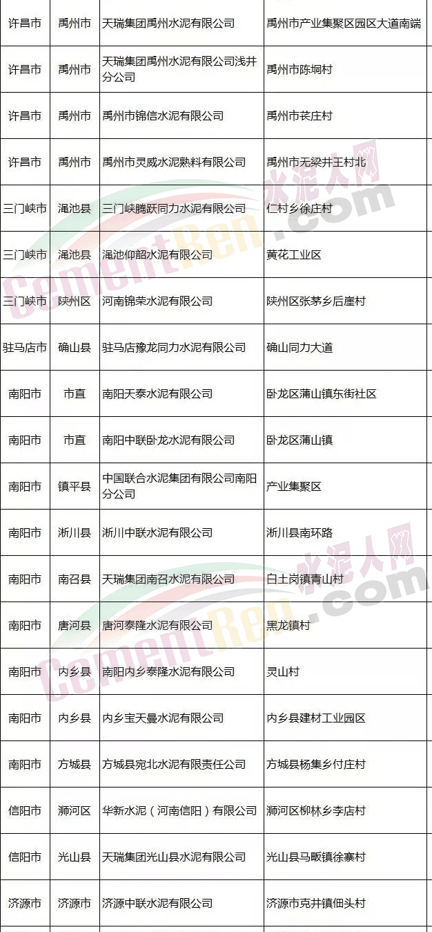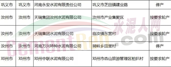 六、鄧州中聯水泥有限公司熟料生產線及汝州市三家水泥企業中位于騎嶺鄉田堂村的河南萬興特種水泥有限公司將按要求于2017年11月15日至2018年3月5日錯峰停產。其余兩家(1位于汝州市產業集聚區的天瑞集團汝州水泥有限公司;2 位于臨汝鎮東營村的天瑞集團水泥有限公司)按要求輪產。