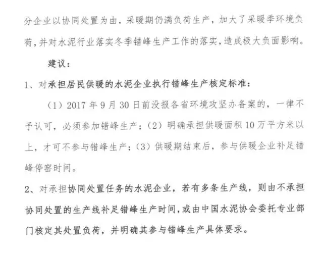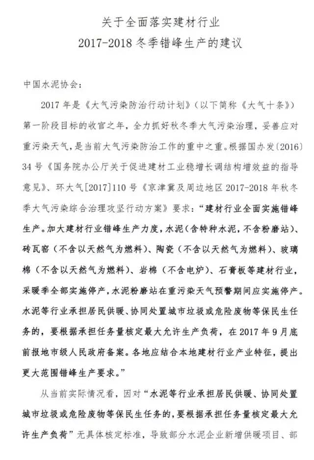 建議函稱2017年是《大氣污染防治行動計劃》(以下簡稱《大氣十條》)第一階段目標的收官之年,全力抓好秋冬季大氣污染治理,妥善應對重污染天氣,是當前大氣污染防治工作的重中之重。根據國辦發【2016】34號《國務院辦公廳關于促進建材工業穩增長調結構增效益的指導意見》、環大氣【2017】110號《京津冀及周邊地區2017-2018年秋冬季大氣污染綜合治理攻堅行動方案》要求:“建材行業全面實施錯峰生產。加大建材行業錯峰生產力度,水泥(含特種水泥,不含粉磨站)等建材行業,采暖季全部實施停產,水泥粉磨站在重污染天氣預警期間實施停產。水泥行業承擔居民供暖、協同處置城市垃圾或危險廢物等保民生任務的,要根據承擔任務量核定最大允許生產負荷 。”