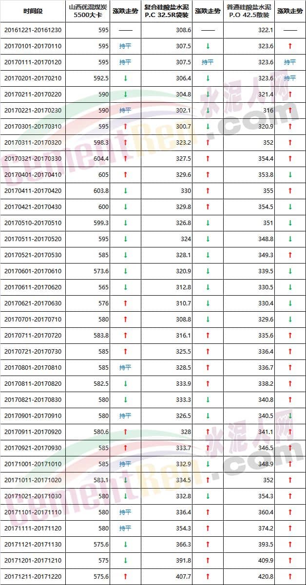 水泥人網(wǎng)同時整理了國家統(tǒng)計(jì)局發(fā)布的2017年全國從1月份到12月份水泥與煤炭每個月的均價情況如下: