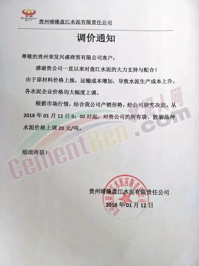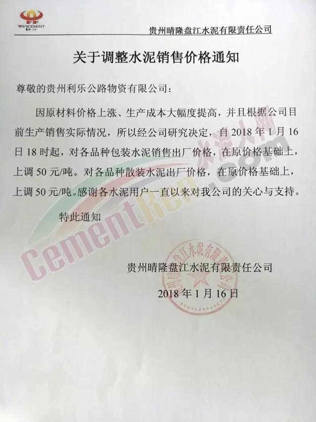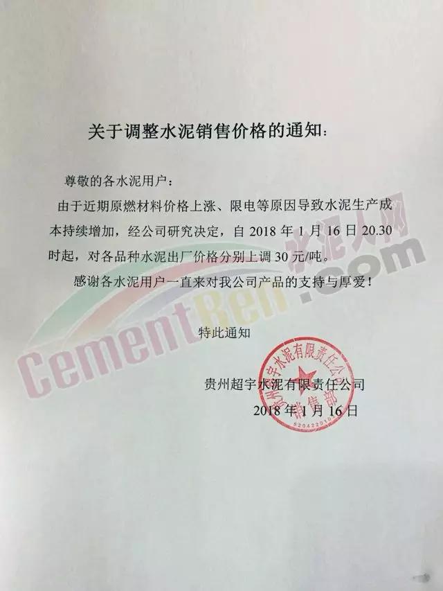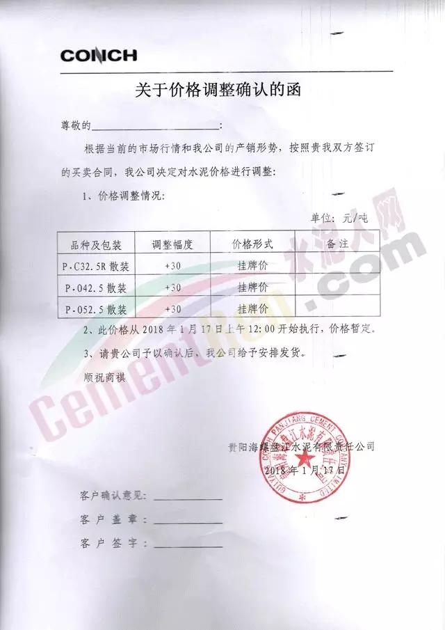 通知,根據(jù)當(dāng)前限電情況、市場(chǎng)形勢(shì)及我公司產(chǎn)銷(xiāo)情況,經(jīng)公司研究決定,2018年1月17日12點(diǎn)對(duì)P.C32.5、P.O42.5、P.O52.5散裝水泥價(jià)格分別上調(diào)30元/噸,感謝您長(zhǎng)期以來(lái)對(duì)貴陽(yáng)海螺的支持與惠顧。
