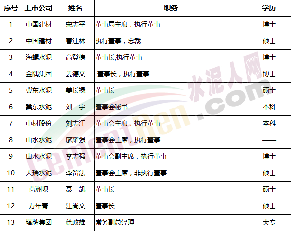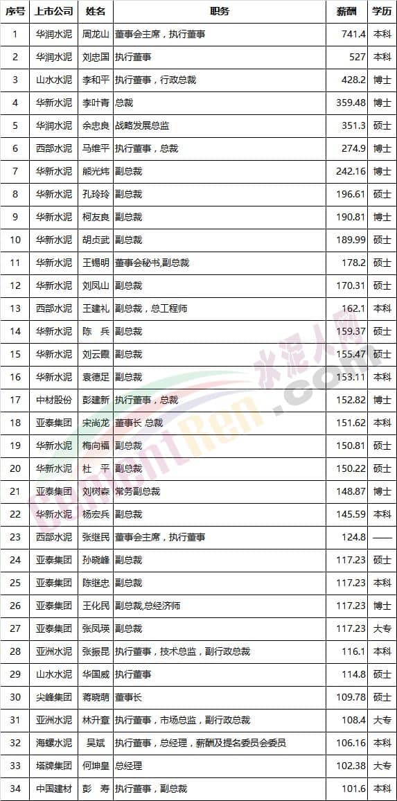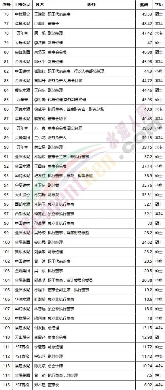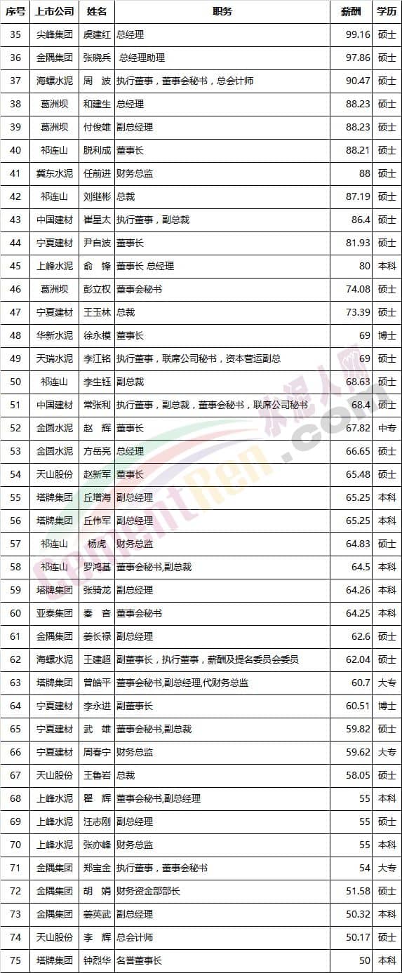 上數(shù)據(jù)僅為部分上市企業(yè)的高管年薪,同時因?yàn)椴糠?a href="http://www.tykjbj.com/news/list_2.html" target="_blank" class="keylink">水泥企業(yè)高管就職于集團(tuán)公司,而不從上市公司領(lǐng)取薪金,因此以上排名尚有不足之處,僅供參考。( 1港元=0.81元人民幣換算)。