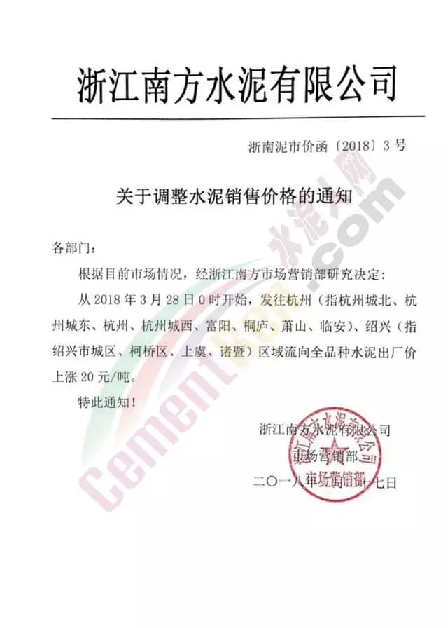 根據目前市場行情及公司產銷形勢,經研究決定:從2018年03月28日零時起各品種散裝水泥在原結算價格基礎上上調10元/噸。