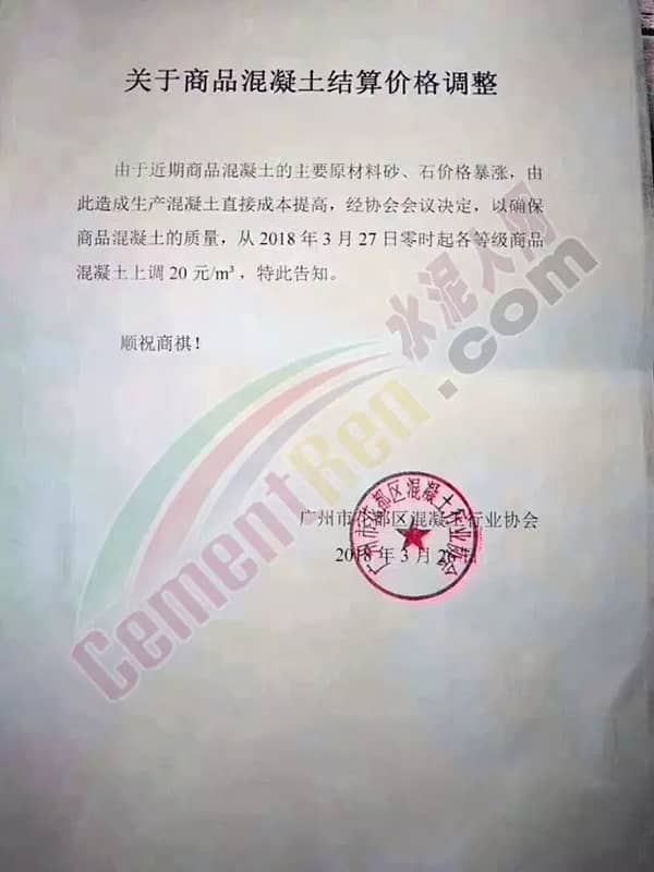 為繼續保質保量提供優質產品,從成本增加的角度考慮,自即日起混凝土企業將各品種混凝土價格在原基礎上上調,上調幅度在20元/立方~30元/立方。