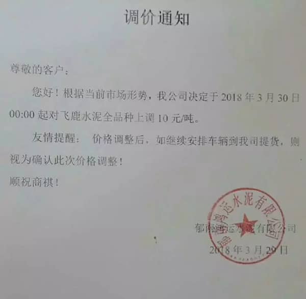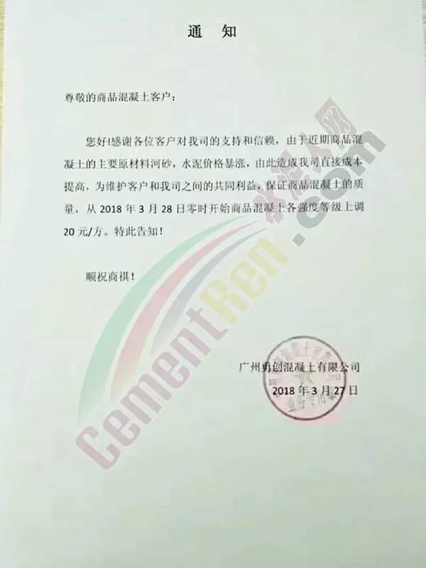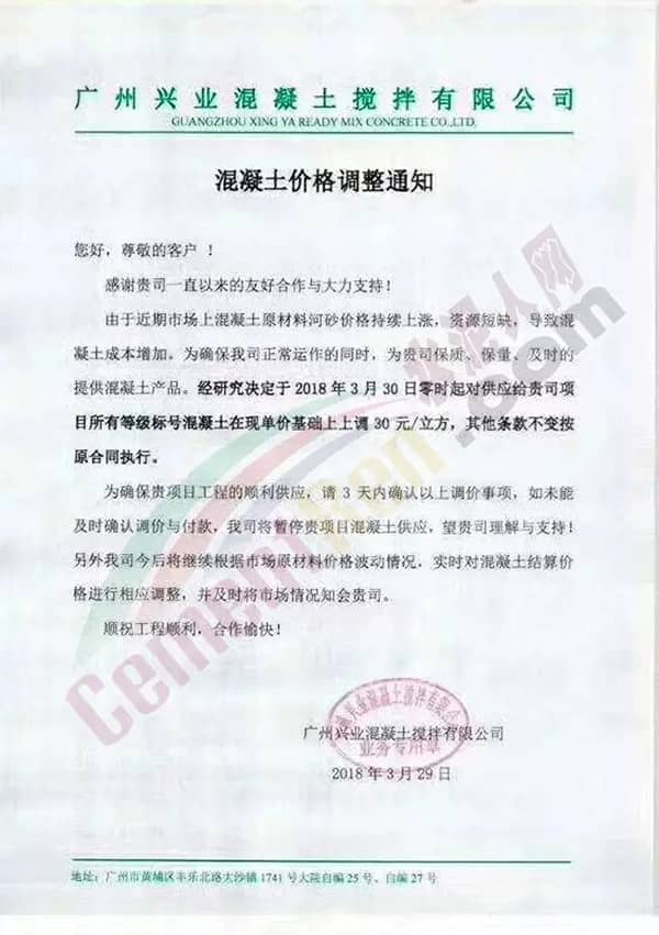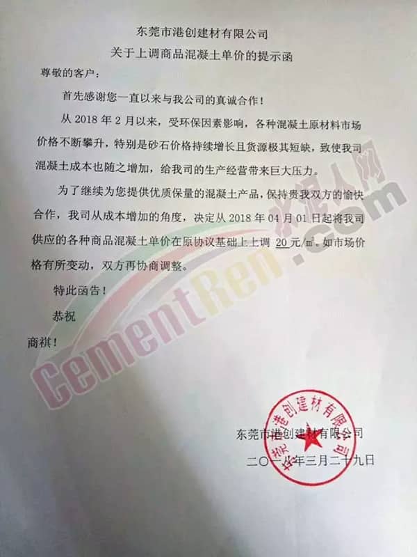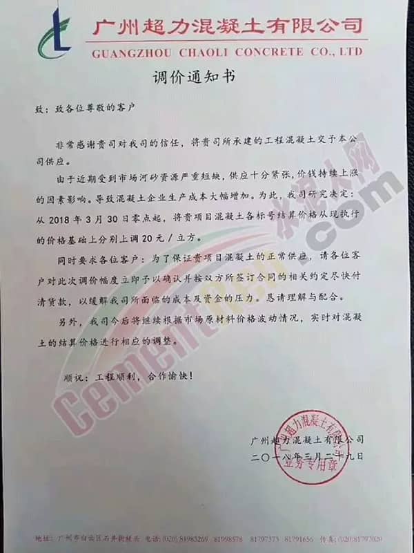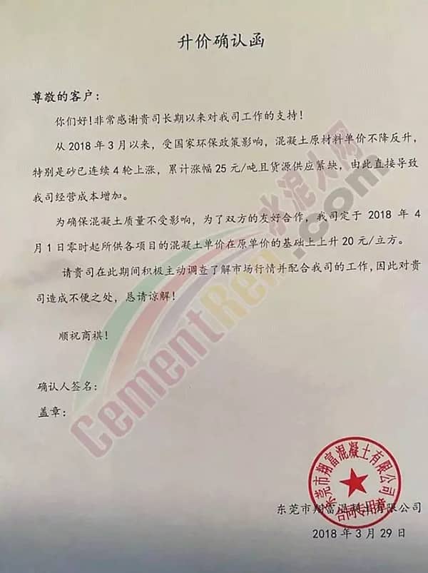 東莞市翔富混凝土有限公司《升價函》中提到,自2018年3月以來,混凝土原材料不降反升,特別是砂已連續4輪上漲,累計漲幅25元/噸,且貨源供應緊張。直接導至混凝土企業經營成本增長。