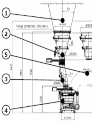 靠一套通氣系統(2)支持,煤粉從煤粉倉(1)流出,轉子秤(4)將煤粉進行定量喂料,傳送空氣(5)從風機中出來,并將煤粉直接吹到燃燒器。轉子秤喂料的高精度確保燃燒器中穩定的空氣/煤粉混合。使用一個下料管(3)將煤粉倉出口與轉子秤(4)相連。