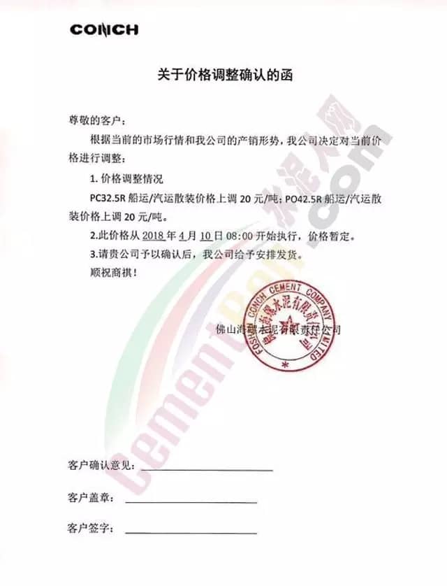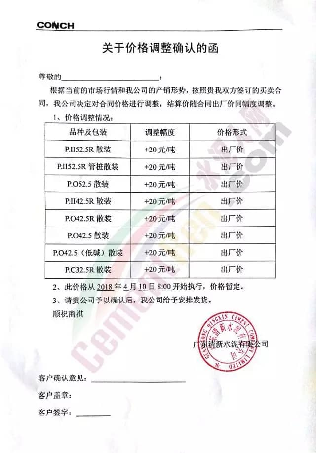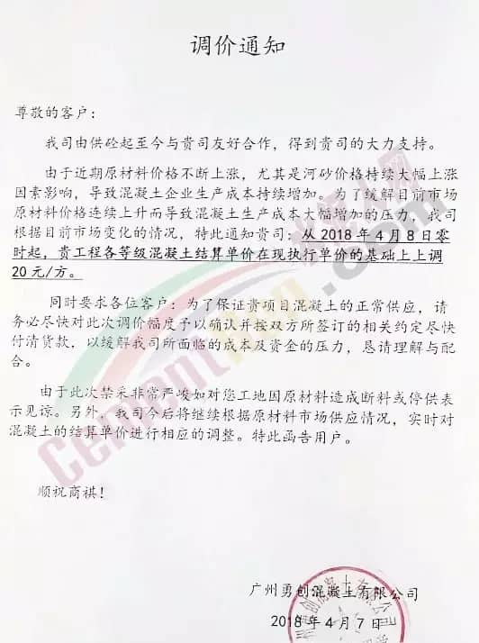 散裝、包裝全品種漲價廣東東方混凝土有限公司4月8日發布調價函稱,由于受到近期混凝土原材料價格持續大幅上漲,特別是中砂、碎石上漲幅度較大,且有時會出現斷供現象,原材料的大幅上漲,使混凝土成本大幅增加,為確保混凝土質量不受影響及各用戶的正常用砼,公司研究決定對混凝土銷售價格進行調整,自2018年4月9日零時起,每立方砼在原單價基礎上上調15元。