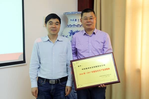 【水泥人網(wǎng)】 近日,中材股份副總裁劉標(biāo)、安全環(huán)保辦公室主任蒲太安一行,到中材株洲為企業(yè)頒發(fā)“2016-2017年度安全生產(chǎn)先進(jìn)集體”獎,中材水泥總經(jīng)理助理賈相華作為企業(yè)代表領(lǐng)獎。
