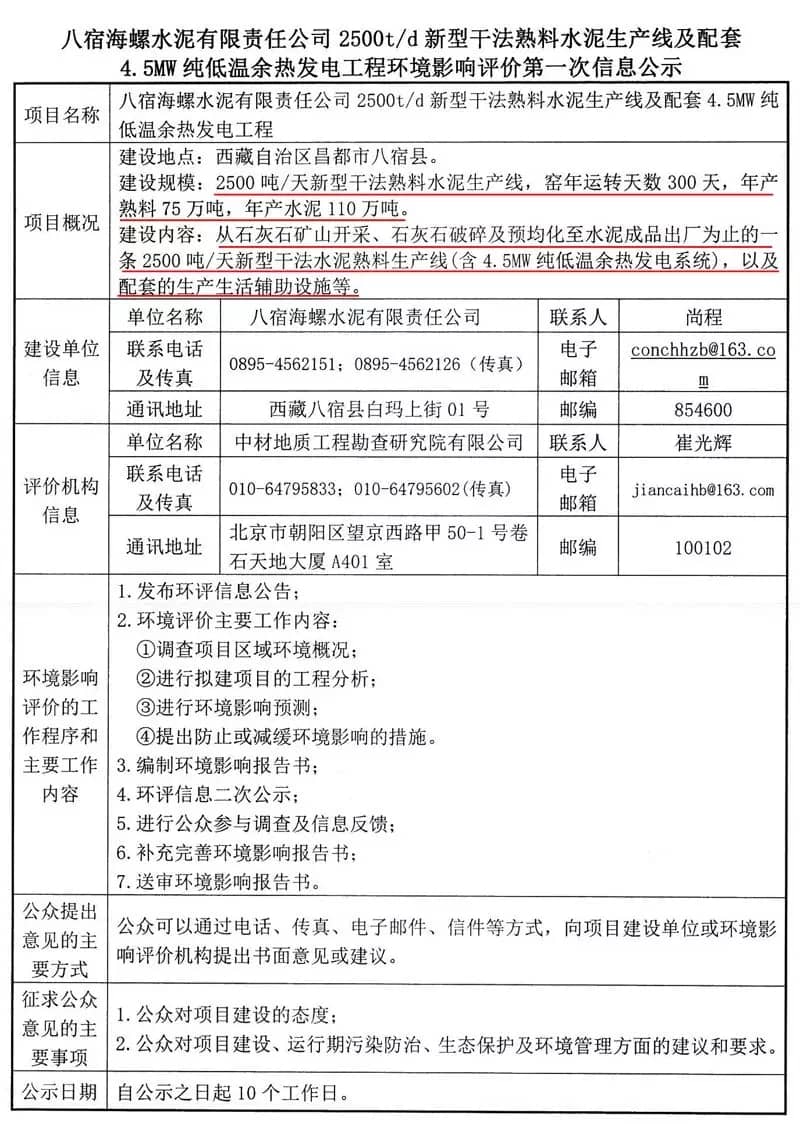 2018年3月5日西藏昌都八宿縣政府官網發布了《八宿海螺水泥有限責任公司環境影響評價第一次信息公示》公示內容如下: