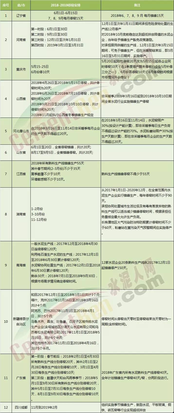 據(jù)水泥人網(wǎng)了解最近一段時(shí)間遼寧、河南、重慶等區(qū)域相繼出臺(tái)了2018年錯(cuò)峰生產(chǎn)計(jì)劃 。其停窯時(shí)間均較往年加長(zhǎng)。遼寧、甘肅等區(qū)域行業(yè)協(xié)會(huì)和主導(dǎo)企業(yè)也組織了非采暖季的錯(cuò)峰停產(chǎn)相關(guān)會(huì)議,遼寧部分地區(qū)主導(dǎo)企業(yè)計(jì)劃在5-6月份停窯限產(chǎn)30日,甘肅省內(nèi)主導(dǎo)企業(yè)于5月9日召開(kāi)了錯(cuò)峰生產(chǎn)協(xié)調(diào)會(huì)議,就非采暖季錯(cuò)峰生產(chǎn)計(jì)劃做了布署。