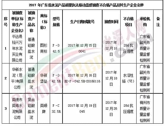 4月28日,廣東省質量技術監督局官網發布2017年廣東省水泥產品質量執法聯動監督抽查結果。其中發現不合格的項目涉及“水溶性鉻(Ⅵ)”“28天抗壓強度”兩個項目。