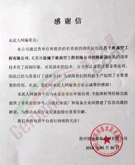 作為行業最大的新媒體平臺,水泥人網每天通過線上線下發出大量信息,亦收到諸多反饋。日前,水泥人網信息平臺收到貴州錦屏和泰水泥有限公司發來的感謝信稱,通過水泥人網所提供的有資質的清庫隊伍江蘇千秋高空工程有限公司,對其公司顧新國帶隊的清庫技術有了深刻的印象。對其清庫技術,安全和認真態度都非常認可。為保障企業的持續生產起到了非常重要的作用,故對水泥人網表示感謝。