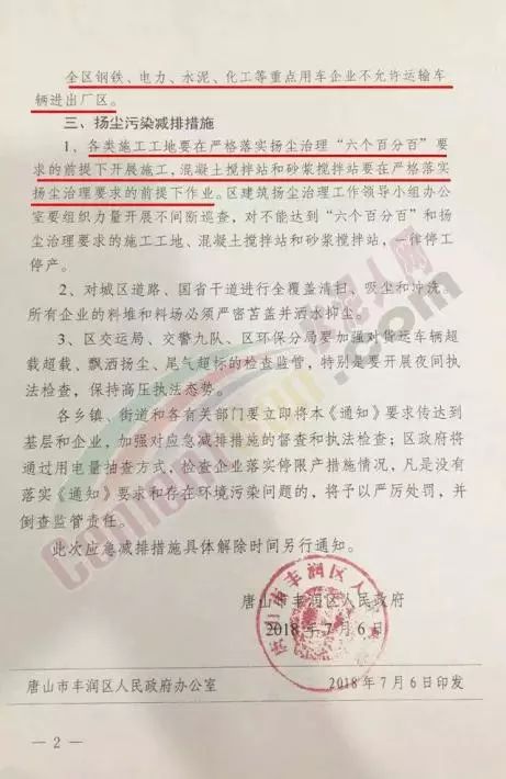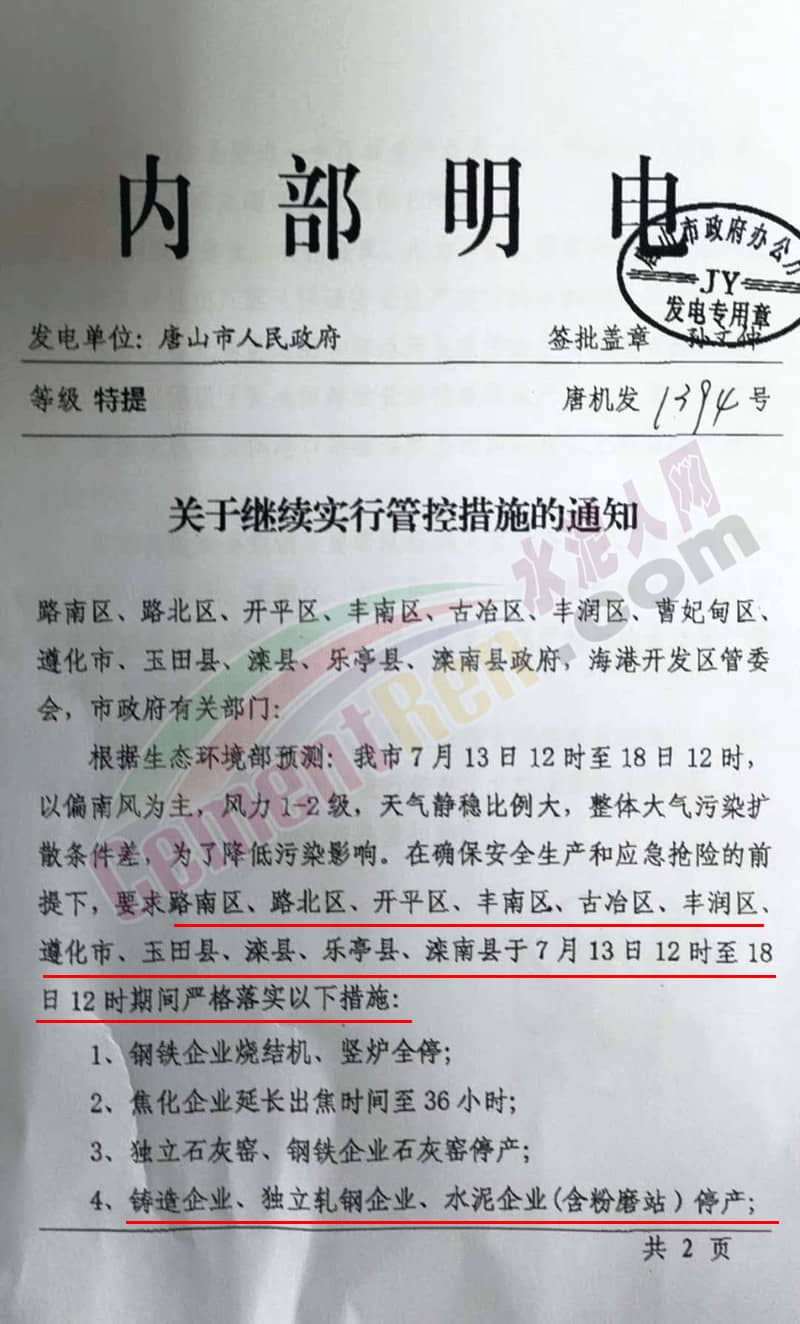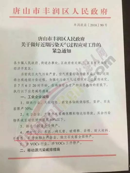 此次唐山市政府為何發(fā)出如此嚴(yán)厲的文件,不得不從前幾日的停產(chǎn)文件說起,7月6日唐山市豐潤區(qū)人民政府發(fā)布關(guān)于做好近期污染天氣過程應(yīng)對工作的緊急通知,要求豐潤區(qū)所屬水泥企業(yè)全部停產(chǎn)(文件如下):