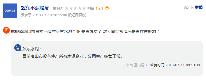 可是在文件發(fā)出以后,豐潤區(qū)的水泥龍頭企業(yè)冀東竟然在投資者平臺上回應(yīng):唐山市沒有停產(chǎn)所有水泥企業(yè),公司生產(chǎn)經(jīng)營一切正常。