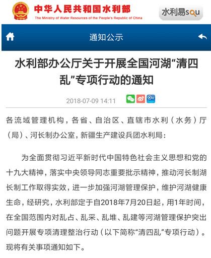 7月9日水利部辦公廳發布《關于開展全國河湖“清四亂”專項行動的通知》。通知稱水利部定于自2018年7月20日起,用1年時間,在全國范圍內對亂占、亂采、亂堆、亂建等河湖管理保護突出問題開展 “清四亂”專項行動。