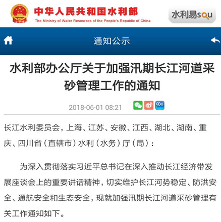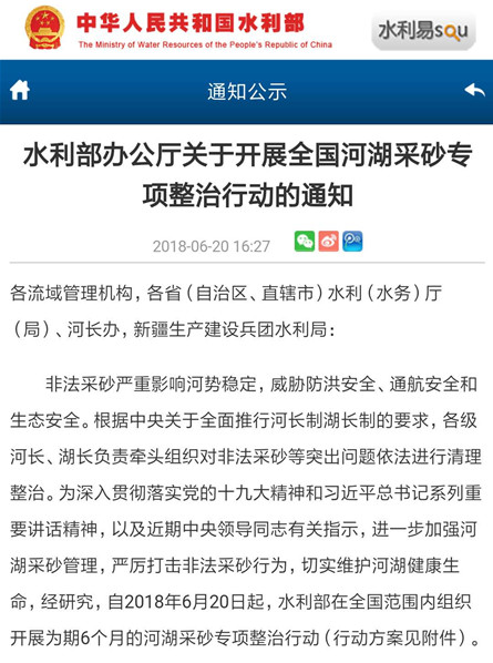 6月20日水利部辦公廳還曾發布一個《關于開展全國河湖采砂專項整治行動的通知》通知稱非法采砂嚴重影響河勢穩定,威脅防洪安全、通航安全和生態安全。根據中央關于全面推行河長制湖長制的要求,各級河長、湖長負責牽頭組織對非法采砂等突出問題依法進行清理整治。