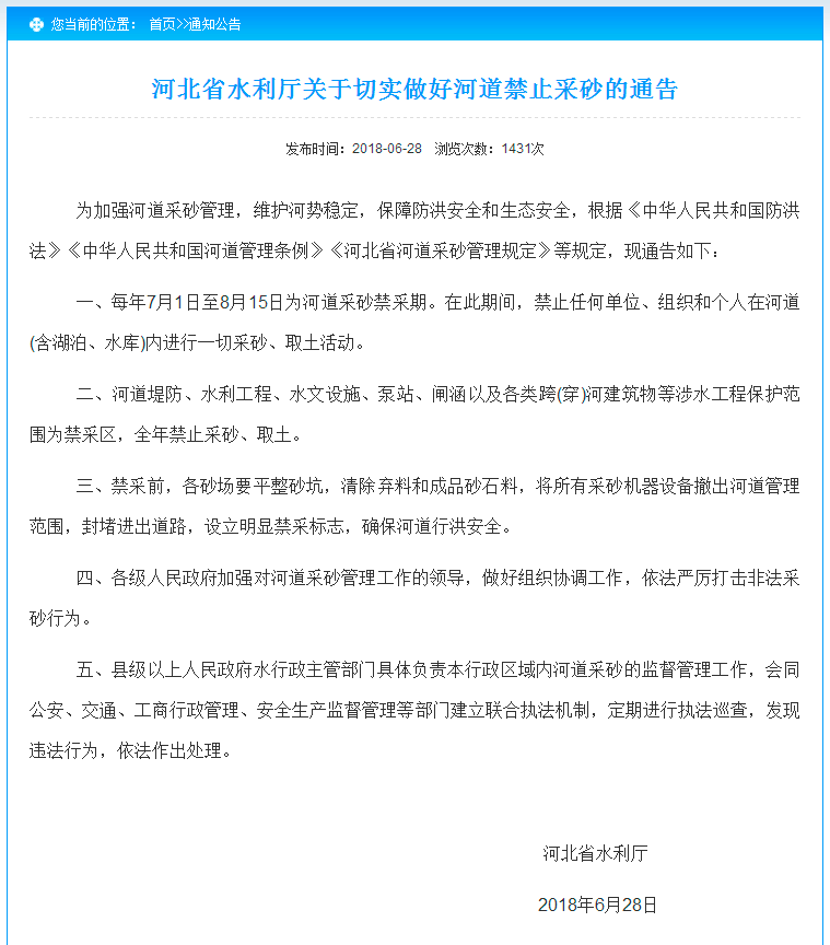 6月28日河北省水利廳發布《關于切實做好河道禁止采砂的通告》,該通告提出,每年7月1日至8月15日為河道采砂禁采期。在此期間,禁止任何單位、組織和個人在河道(含湖泊、水庫)內進行一切采砂、取土活動。