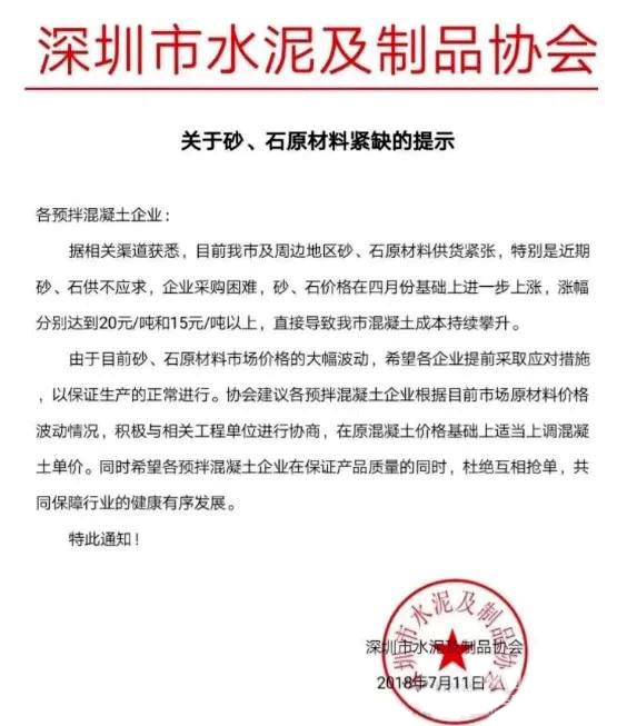 7月11日深圳水泥及制品協會發布關于砂、石原材料緊缺的提示,提示稱據相關渠道獲悉,深圳及周邊地區砂、石原材料供貨緊張,特別是近期砂、石供不應求,企業采購困難,砂、石價格在四月份基礎上進一步上漲,漲幅分別達到20元/噸和15元/噸以上,直接導致深圳市混凝土成本持續攀升。由于目前砂、石原材料市場價格的大幅波動,協會希望各企業提前采取對應措施,以保證生產的正常進行。協會建議各預拌混凝土企業根據目前市場原材料價格波動情況,積極與相關工程單位進行協商,在原混凝土價格基礎上適當上調混凝土單價。希望各預拌混凝土企業在保證產品質量的同時,杜絕互相搶單,共同保障行業的健康有序發展。