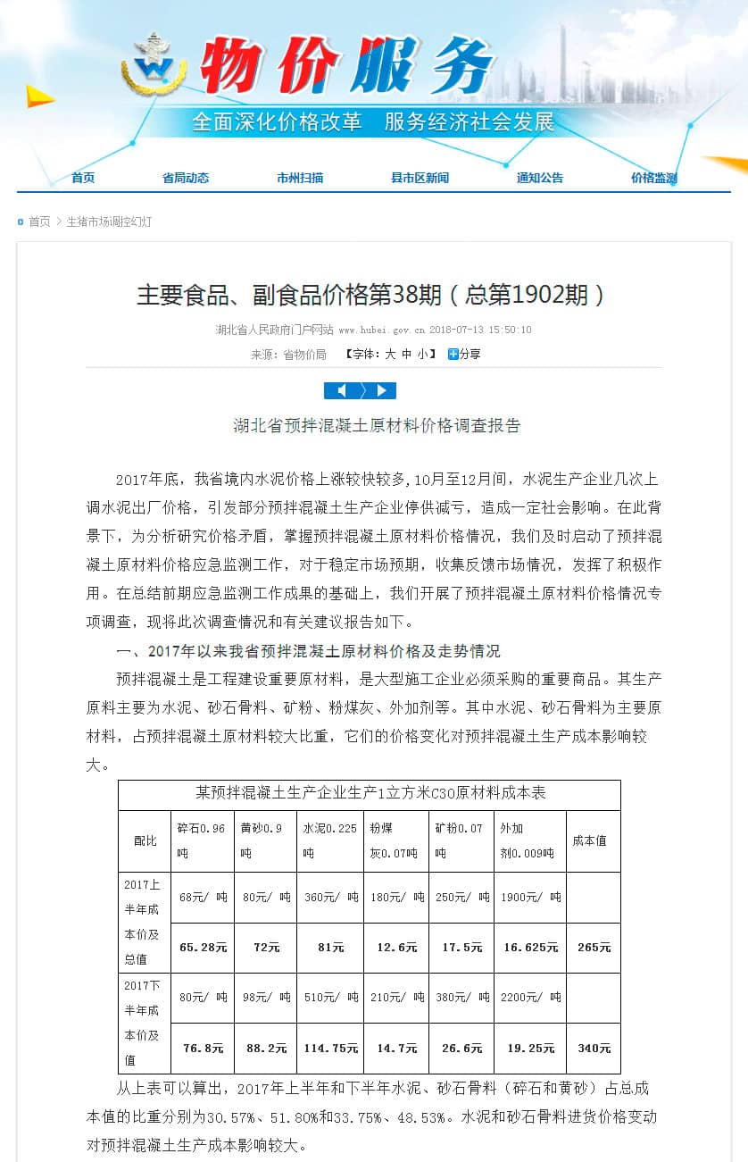 2018年7月13日,湖北省人民政府網站發布《湖北省預拌混凝土原材料價格調查報告》,報告稱2017年底,湖北省境內水泥價格上漲較快較多,10月至12月間,水泥生產企業幾次上調水泥出廠價格,引發部分預拌混凝土生產企業停供減虧,造成一定社會影響。