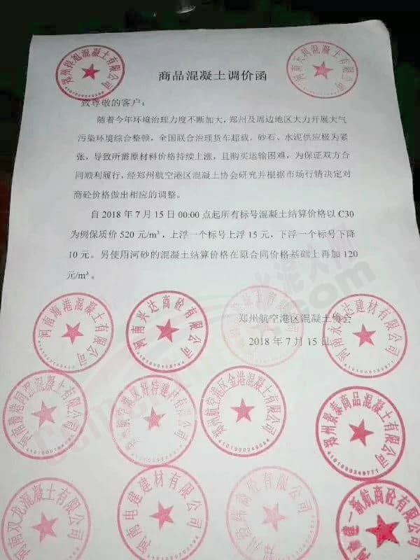日前,鄭州航空港區(qū)混凝土協(xié)會十四家商混企業(yè)集體發(fā)布商品混凝土調(diào)價函稱,隨著今年環(huán)境治理力度不斷加大,鄭州及周邊地區(qū)大力開展大氣污染環(huán)境綜合整頓,全國聯(lián)合治理貨車超載,砂石、水泥供應(yīng)極為緊張,導(dǎo)致所需原材料價格持續(xù)上漲,且購買運輸困難,為保證雙方合同順利履行,經(jīng)鄭州航空港區(qū)混凝土協(xié)會研究并根據(jù)市場行情決定對商砼價格做出相應(yīng)的調(diào)整。