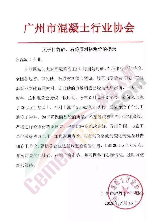 7月16日廣州市混凝土行業(yè)協(xié)會《關(guān)于目前砂、石等原材料漲價的提示》稱,目前國家加大對環(huán)境整治工作,特別是對砂、石污染行業(yè)的整治。全國各地省、市的砂、石原材料供應(yīng)緊缺,甚至出現(xiàn)斷供情況,有錢都買不到砂石原材料。目前砂的市場銷售已經(jīng)是無序漲價,一天一個價格,這種現(xiàn)象會持續(xù)一段時間。