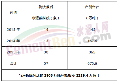 實際上,根據(jù)公告文件計算,2013年度云南省淘汰落后水泥熟料生產(chǎn)線14條產(chǎn)能143萬噸,2014年度淘汰落后水泥熟料生產(chǎn)線13條產(chǎn)能167.6萬噸,2015年度淘汰落后水泥熟料生產(chǎn)線30條產(chǎn)能365萬噸。即,2012年底至2015年底以來,云南省共拆除淘汰落后產(chǎn)能僅675.6萬噸,與應拆除淘汰的2905萬噸產(chǎn)能相差2229.4萬噸!公告拆除產(chǎn)能與按等量置換應拆除產(chǎn)能嚴重不符,如下表所示: