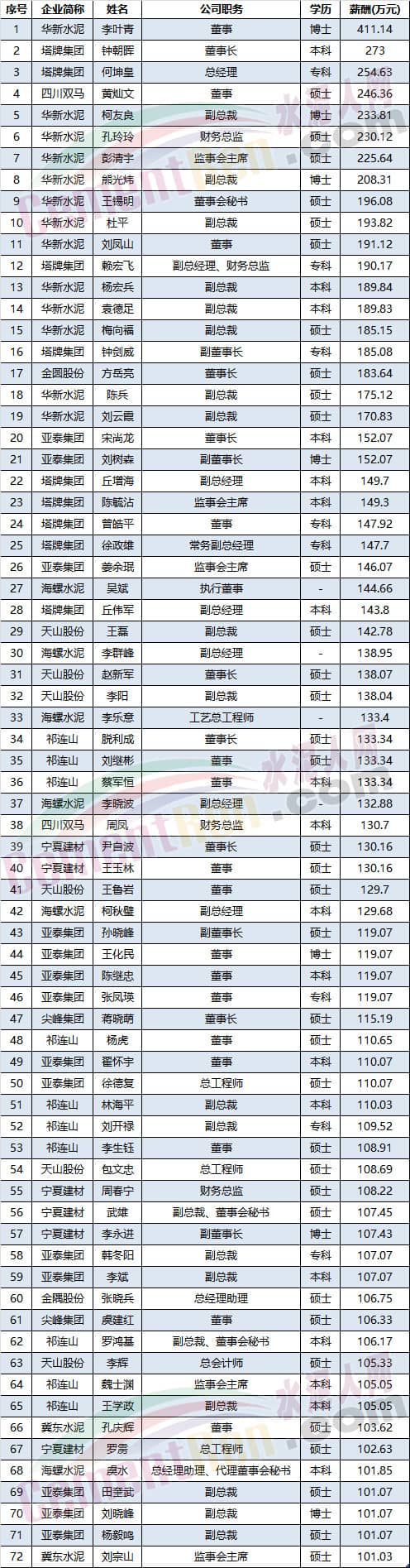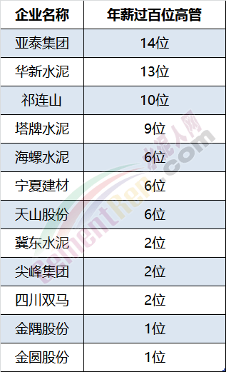 其中亞泰集團有14位高管年薪過百萬,華新水泥有13位高管年薪過百萬。是百萬年薪最多的水泥企業。