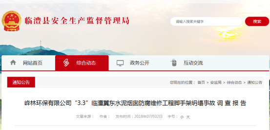 事故發(fā)生經(jīng)過:今年3月3日7:30分,施工人員李南方、張二中、郭小亮、靳文杰(靳志平之子)到達(dá)一樓倉庫房簽到,然后一起運砂,往砂罐里裝砂,8:15左右碰到鄧新華(高云峰安排相關(guān)設(shè)備安裝由鄧新華負(fù)責(zé))過來并且說,熊尚清、熊先平昨天下午在上面煙囪內(nèi)進(jìn)行管壁切割時,發(fā)現(xiàn)腳手架有傾斜現(xiàn)象,要求我們上去人,幫助他們把腳手架進(jìn)行加固,8:20分左右靳文杰、郭小亮、李南方、鄧新華四個人一起坐電梯上到了五層煙囪準(zhǔn)備自行加固腳手架,李南方、郭小亮分別找了幾個扣件,從五層煙囪切割出來的孔門進(jìn)入煙囪,準(zhǔn)備進(jìn)行腳手架支撐桿上面橫向桿上移,李南方先下去,靳文杰給郭小亮遞了幾個扣件,和鄧新華遞了幾根鋼管,熊尚清、熊先平一同進(jìn)入煙囪準(zhǔn)備從事切割工作,然后鄧新華離開五層施工現(xiàn)場。大概8時27分靳文杰聽見嘩啦鋼管掉落的聲音,大概掉落聲音持續(xù)了十幾秒,聲音停止后靳文杰從五層的孔門伸頭進(jìn)去看到煙囪內(nèi)的腳手架已經(jīng)全部坍塌,靳文杰向下面喊李南方的名字,李南方在里面還能應(yīng)答,8時30分左右便立即打了120并報了具體的位置,120說讓打5656120,隨后又打了5656120,又馬上給夏煥平打電話報告腳手架坍塌情況。