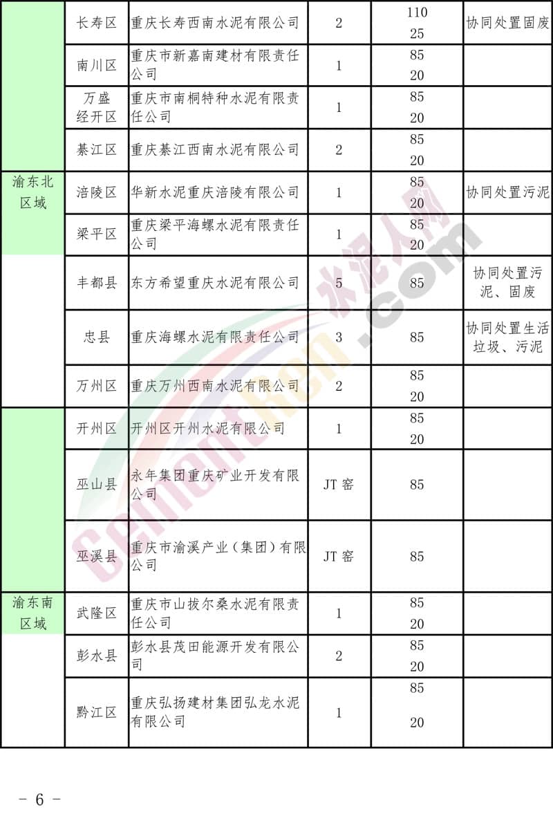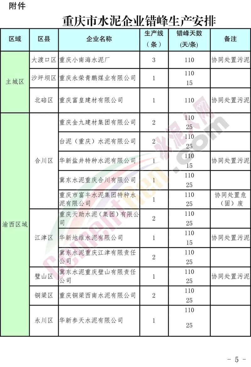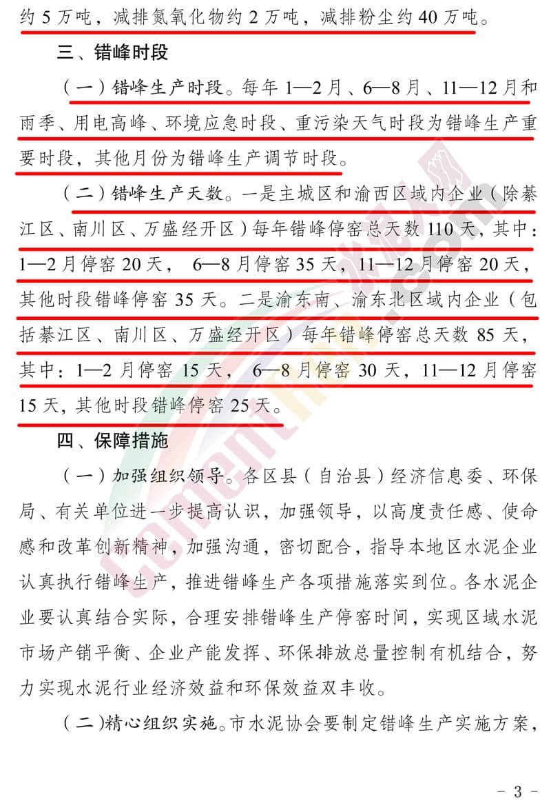主城區(qū)和渝西區(qū)域內(nèi)企業(yè)(除綦江區(qū)、南川區(qū)、萬盛經(jīng)開區(qū))每年錯峰停窯總天數(shù)110天,其中:1-2月停窯20天,6-8月停窯35天,11-12月停窯20天,其他時段錯峰停窯35天;